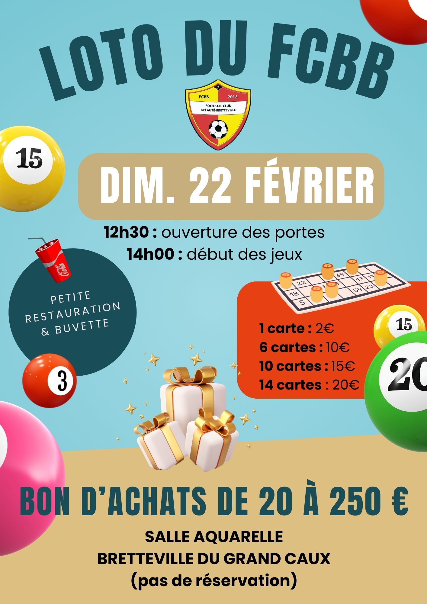 14H00 début des jeux 12H30 ouverture des portes à gagner bons d’achats de 20 à 250 € Petite restauration et buvette