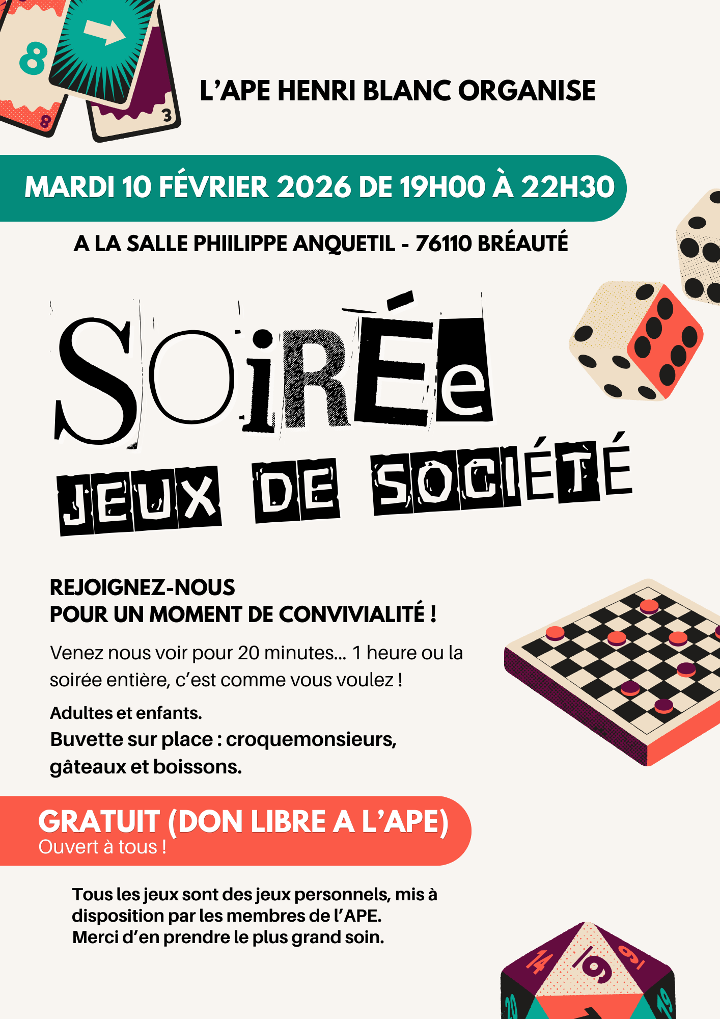 L’APE de l’école Henri Blanc de Bréauté organise sa 2ème soirée jeux, le mardi 10 février de 19h à 22h30